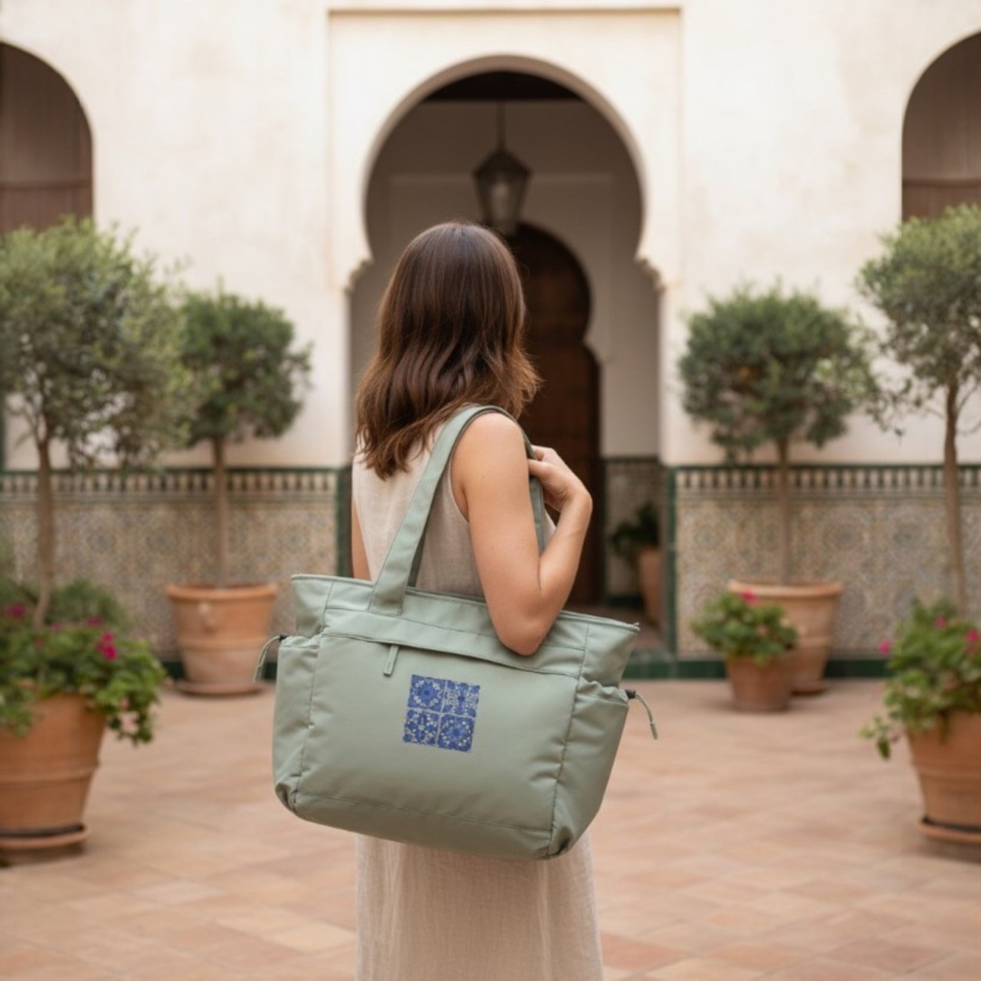 With its striking geometric embroidery on the front, this oversized tote blends everyday practicality with timeless style. Inspired by traditional Andalusian tile work, the intricate four-tile motif reflects the rich artistry and balanced symmetry of Moorish design. Crafted from 100% recycled polyester, it offers a spacious interior ideal for weekend escapes, while soft, wide shoulder straps provide all-day carrying comfort.