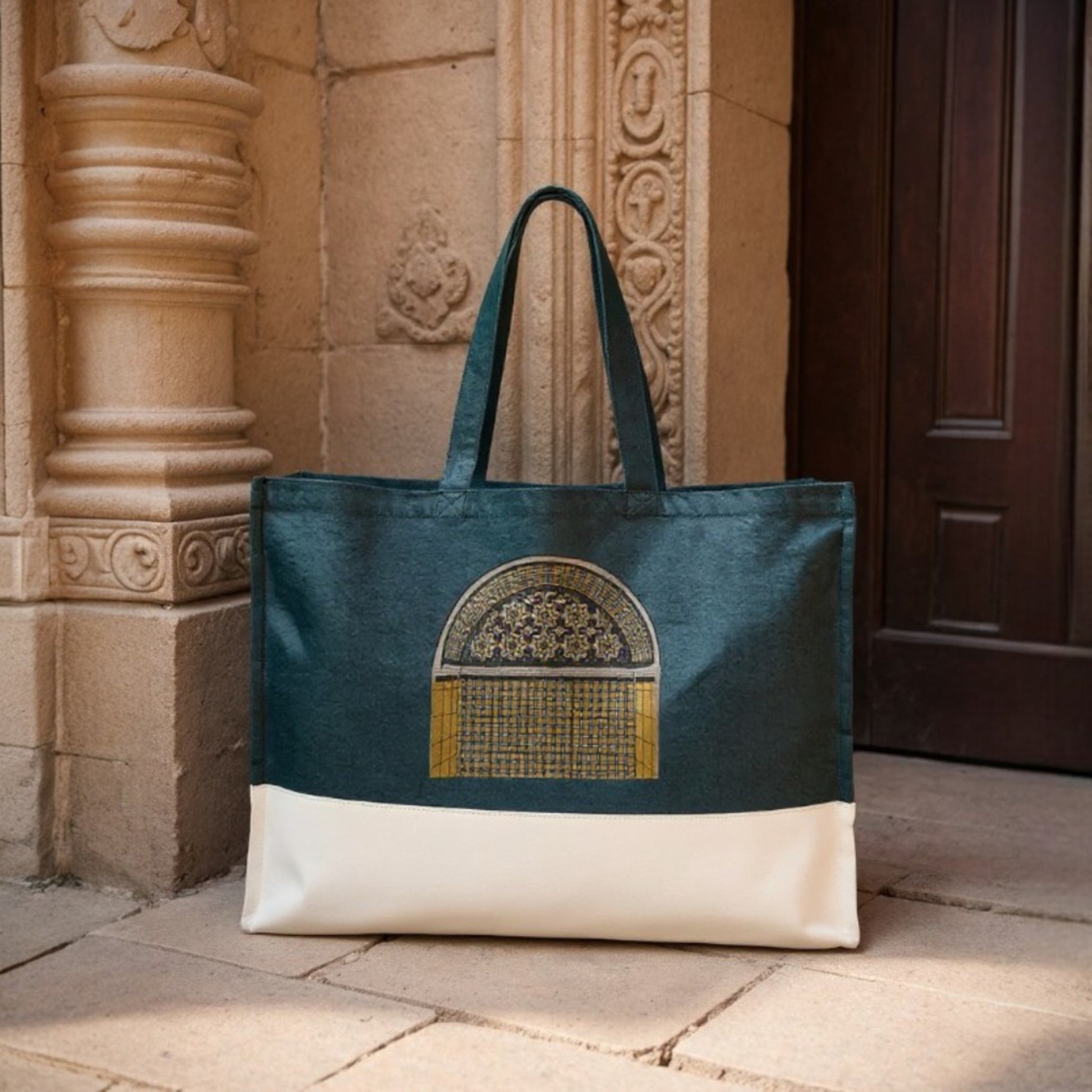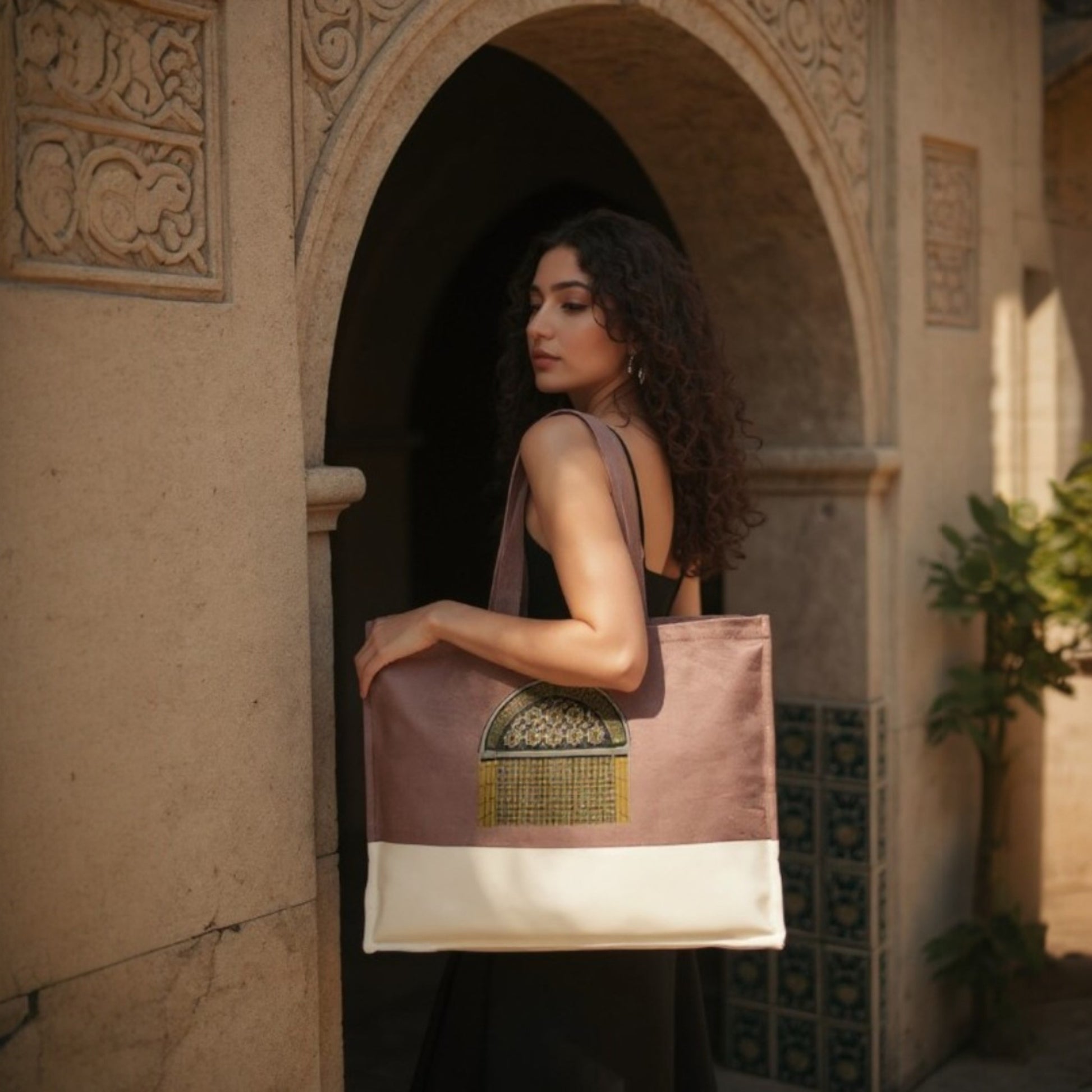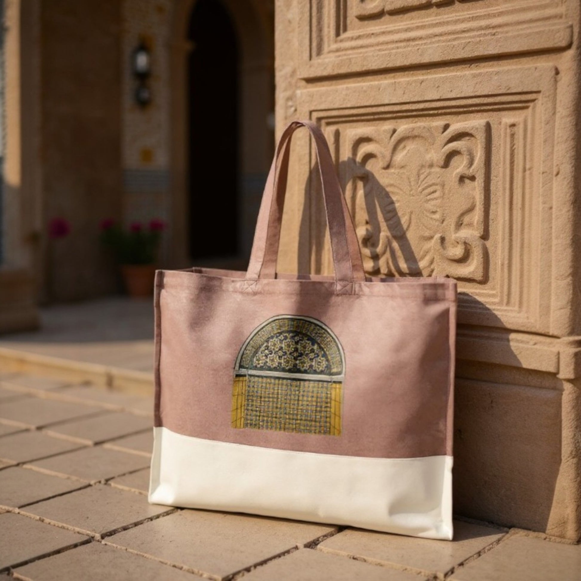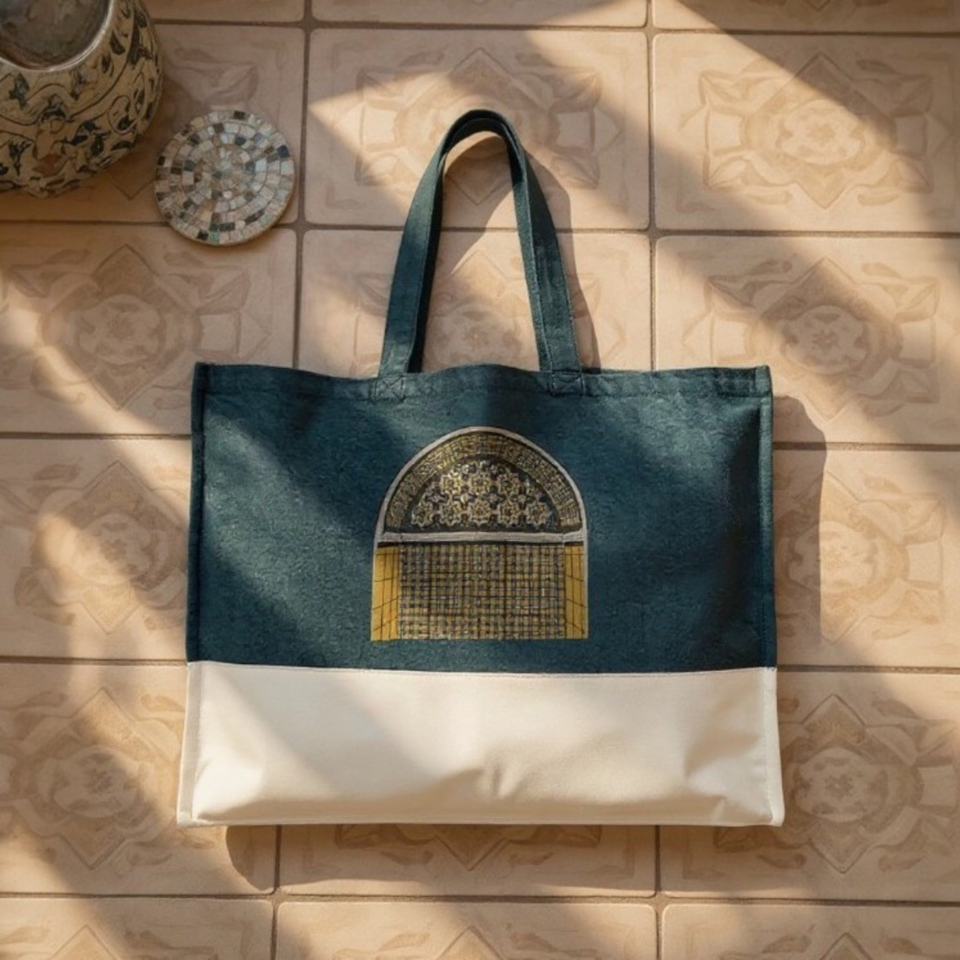 With its elegant printed archway design, this contrast shopper blends everyday practicality with sustainable style. The artwork is inspired by the traditional mashrabiya windows and ornate tilework found in historic Lebanese and Middle Eastern architecture, celebrating craftsmanship, geometry, and cultural heritage. Crafted from 100% organic cotton canvas, this eco-friendly tote features a durable construction, contrast base, and wide straps for comfortable carrying. Its spacious interior makes it perfect for shopping, work, or daily essentials.