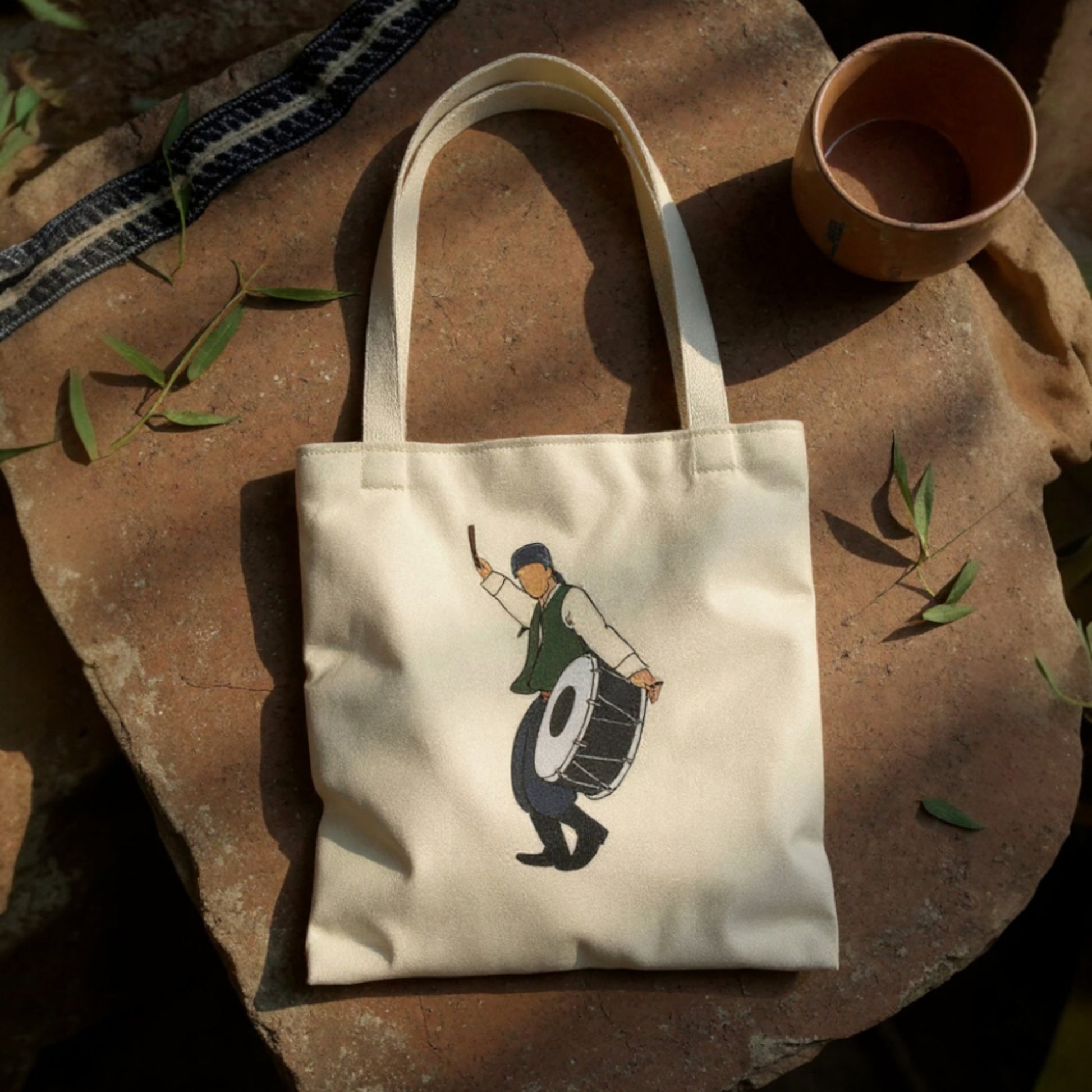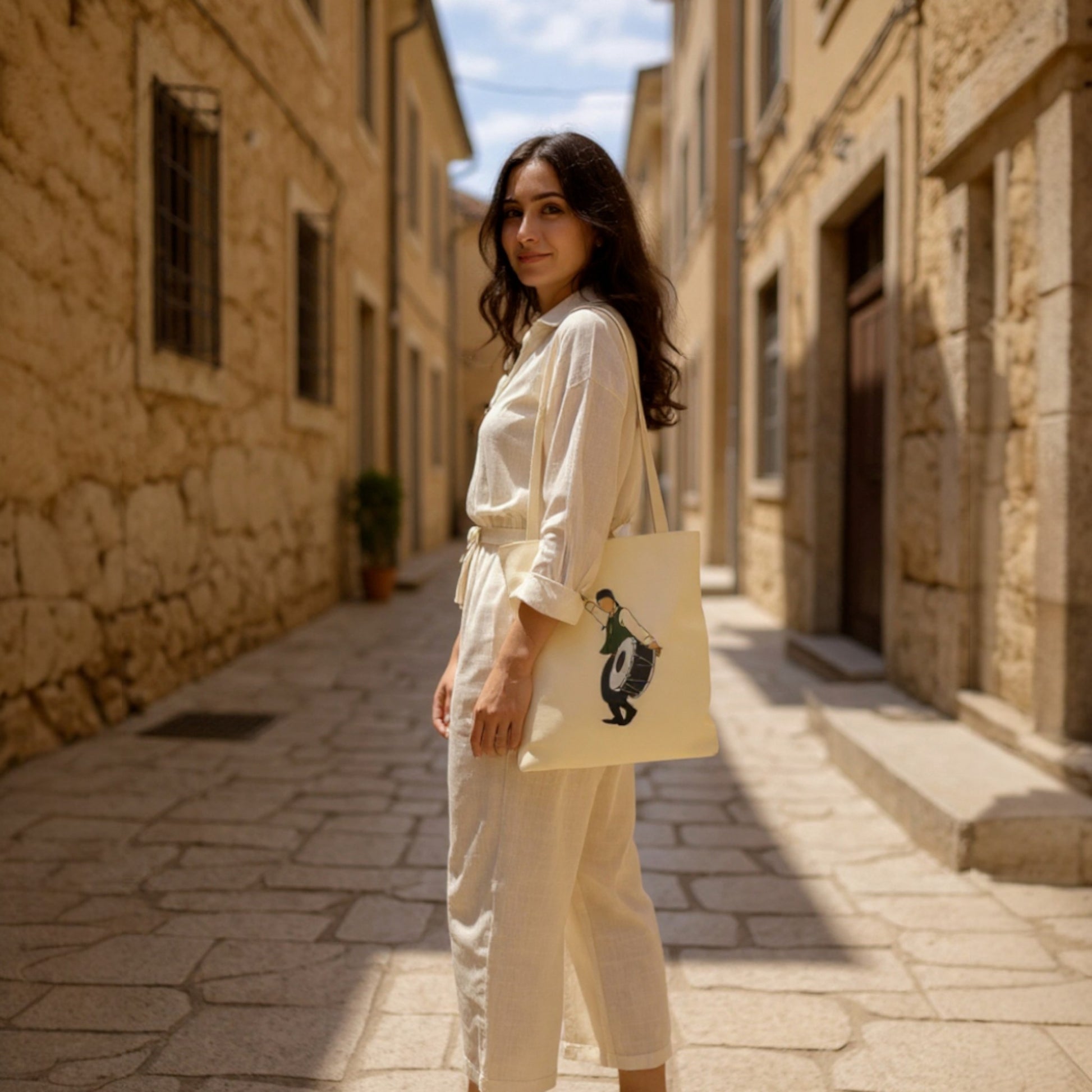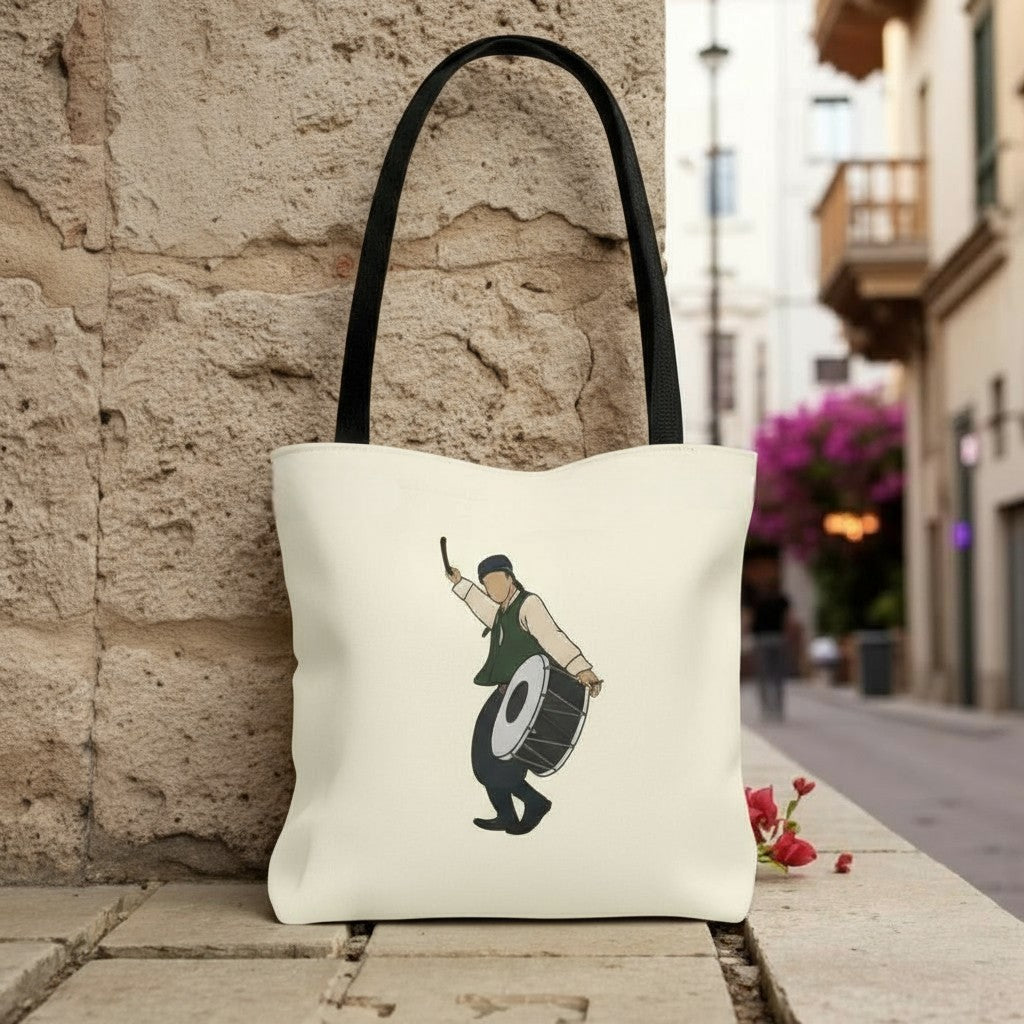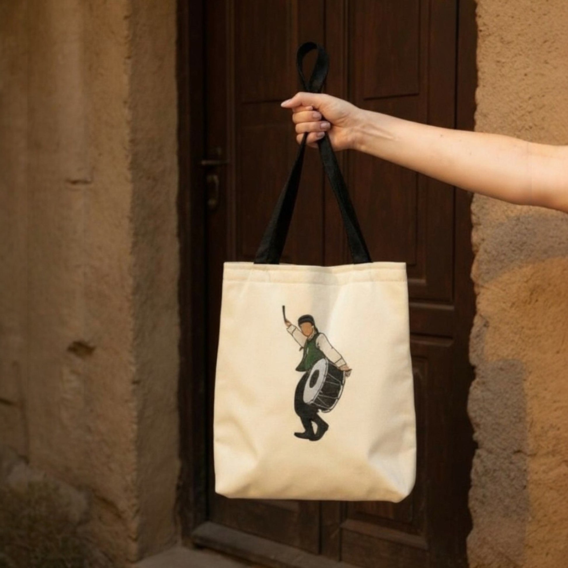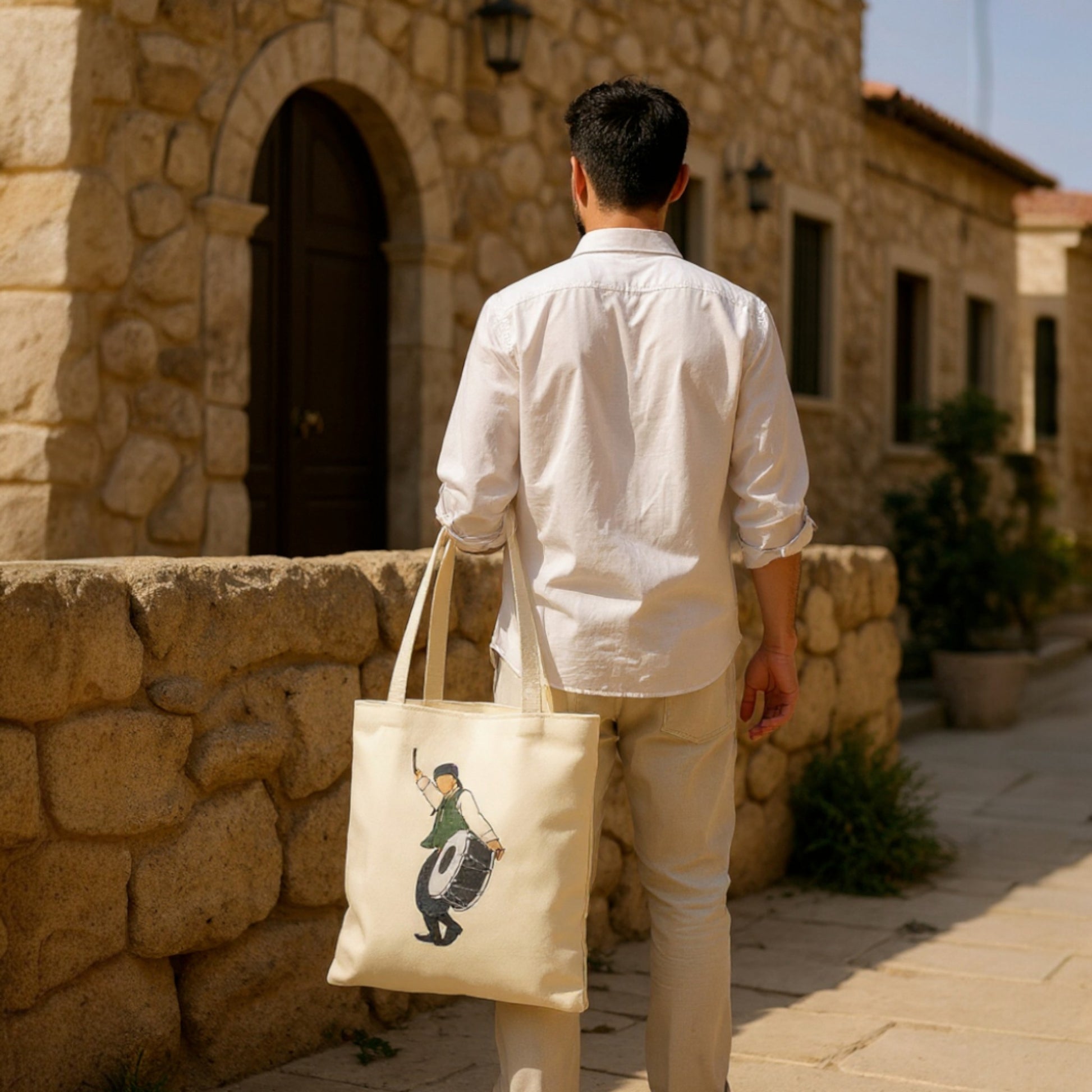 With its lively illustration of a Lebanese drummer mid-step, this printed tote brings cultural spirit and everyday practicality into one striking design. The image captures the energy of traditional darbakeh and tabl performances, often seen in weddings and celebrations across Lebanon.