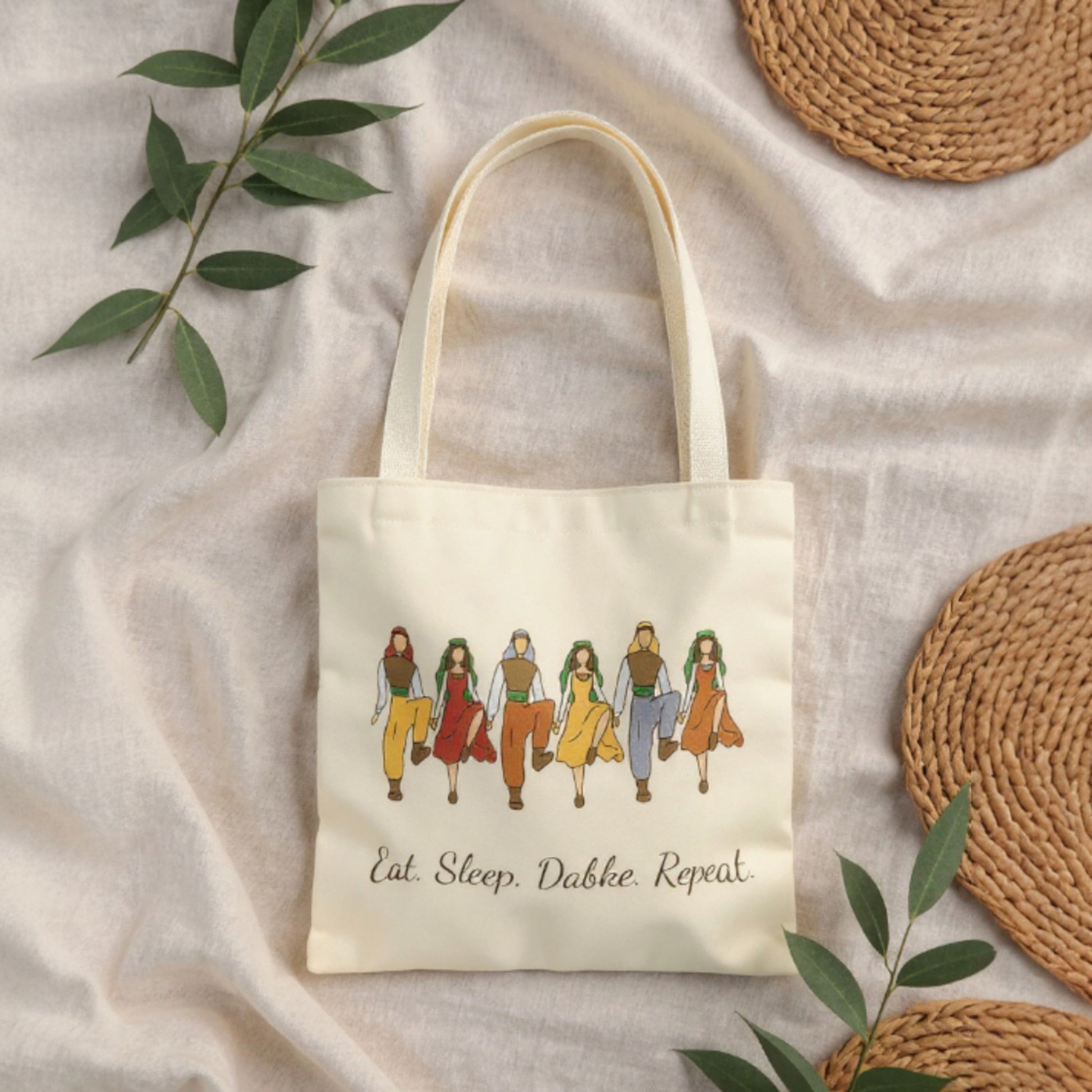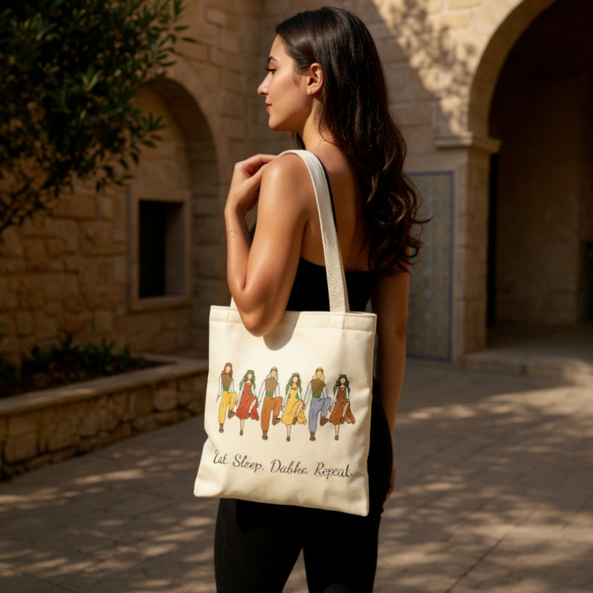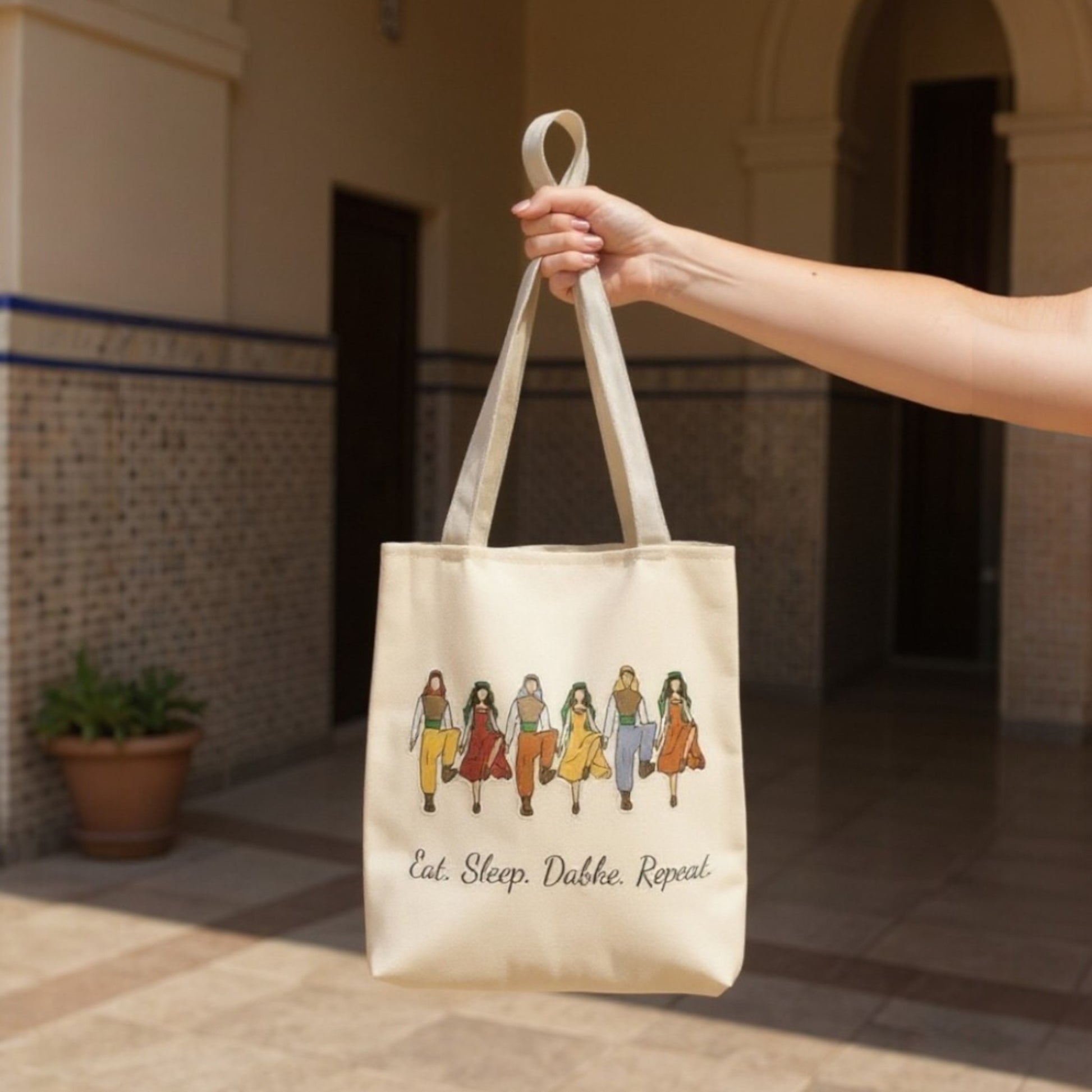 With its fun and vibrant illustration of dabke dancers in traditional dress, this printed tote is made for those who live by the rhythm of the beat. Paired with the playful phrase “Eat. Sleep. Dabke. Repeat.”, it’s a joyful nod to Levantine culture and the energy of this beloved folk dance.