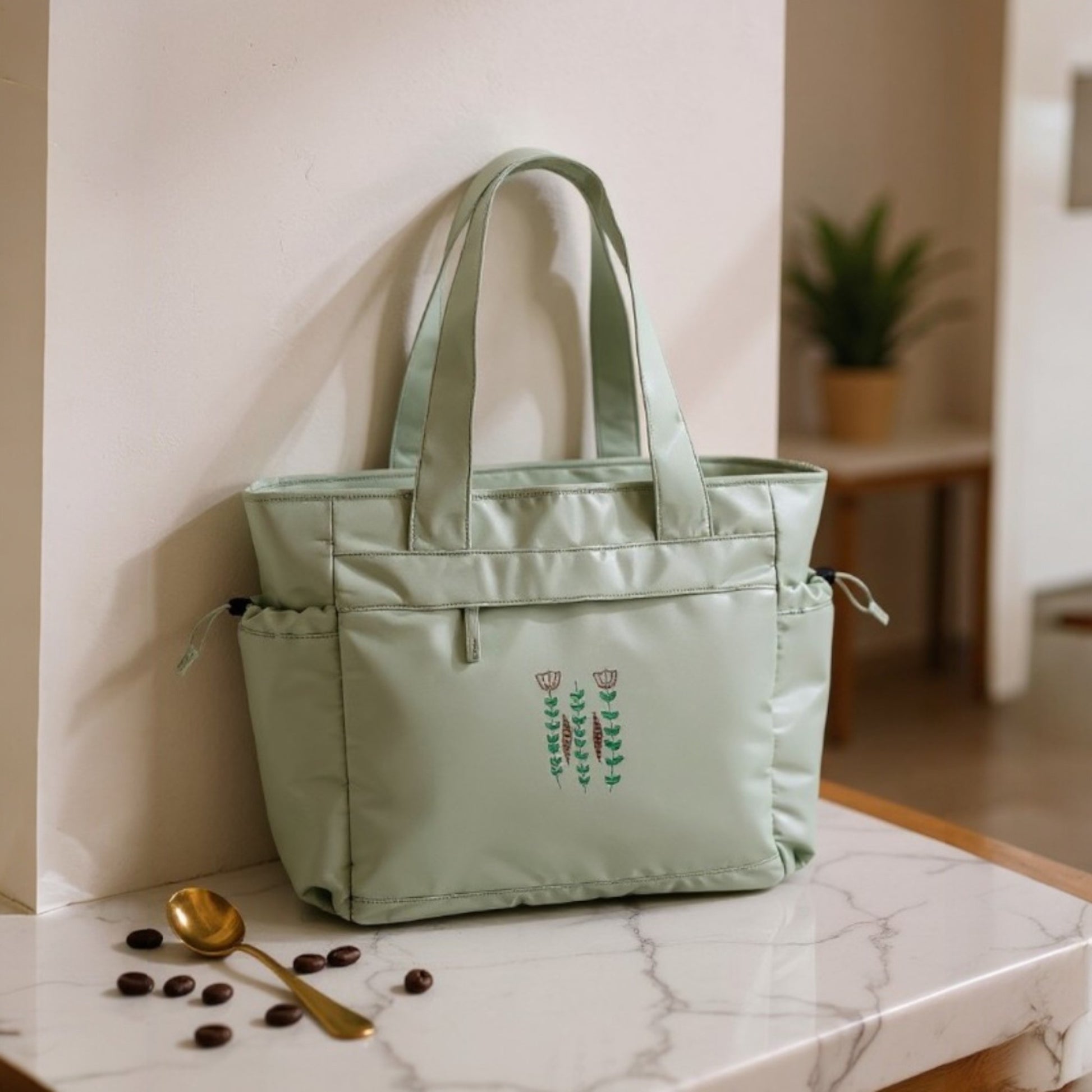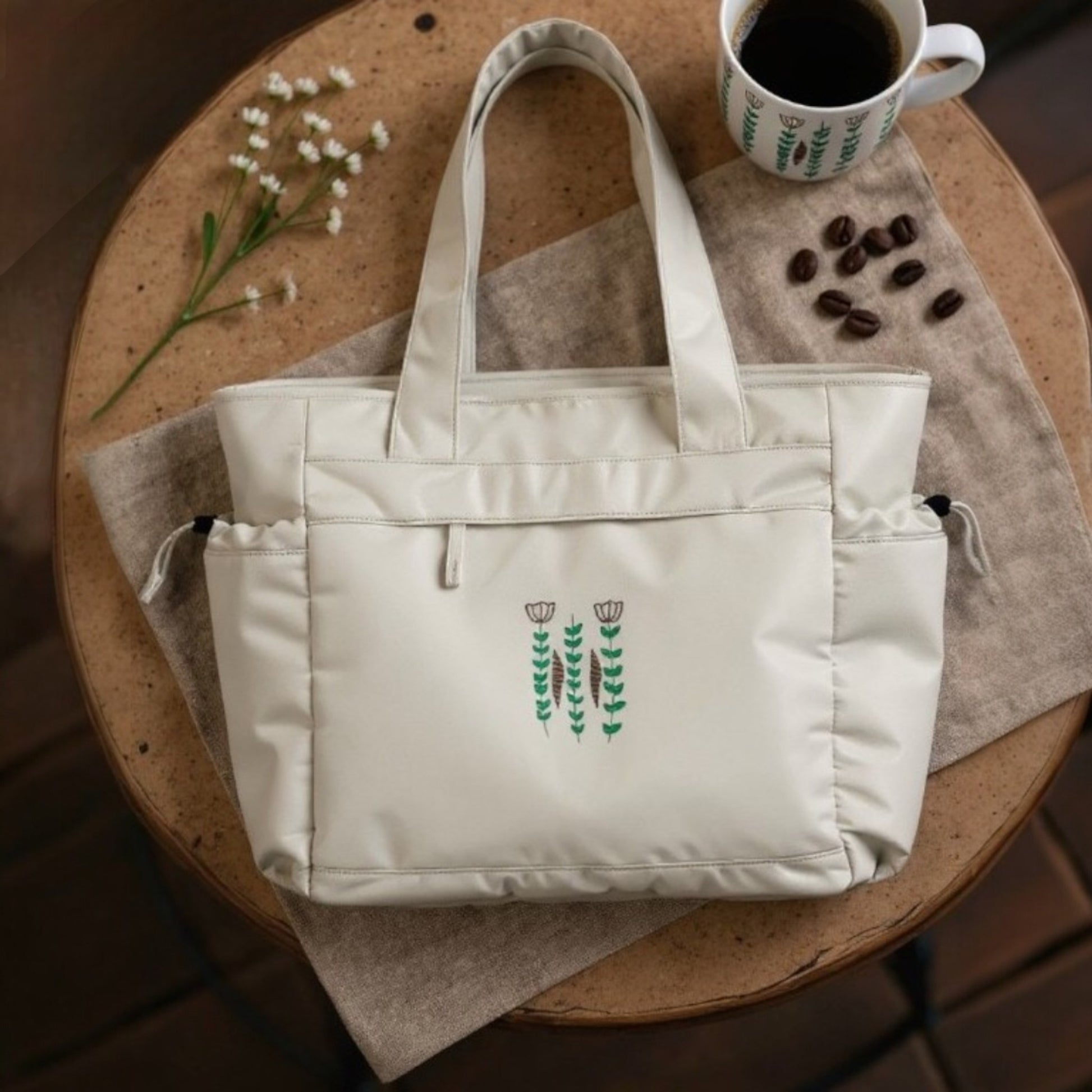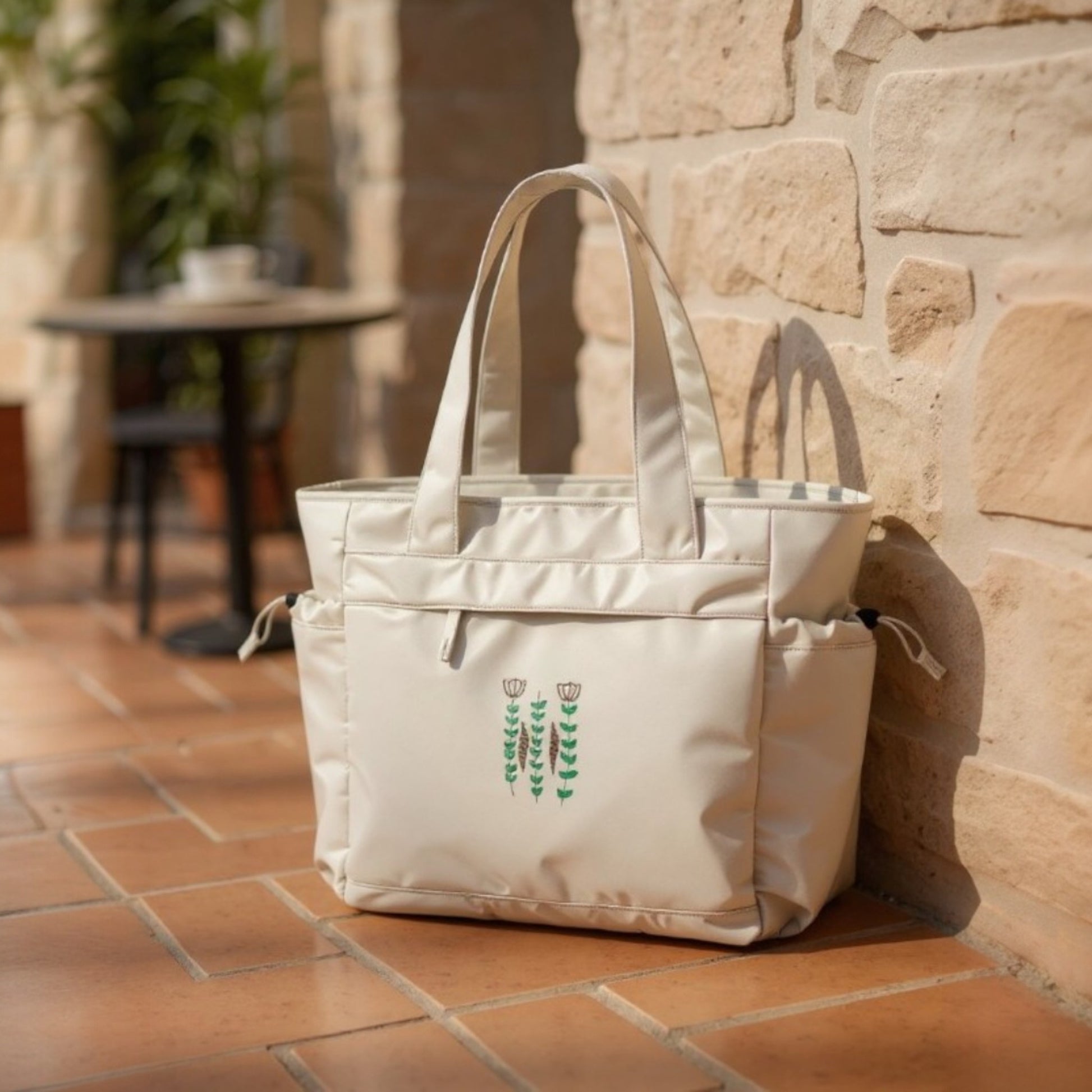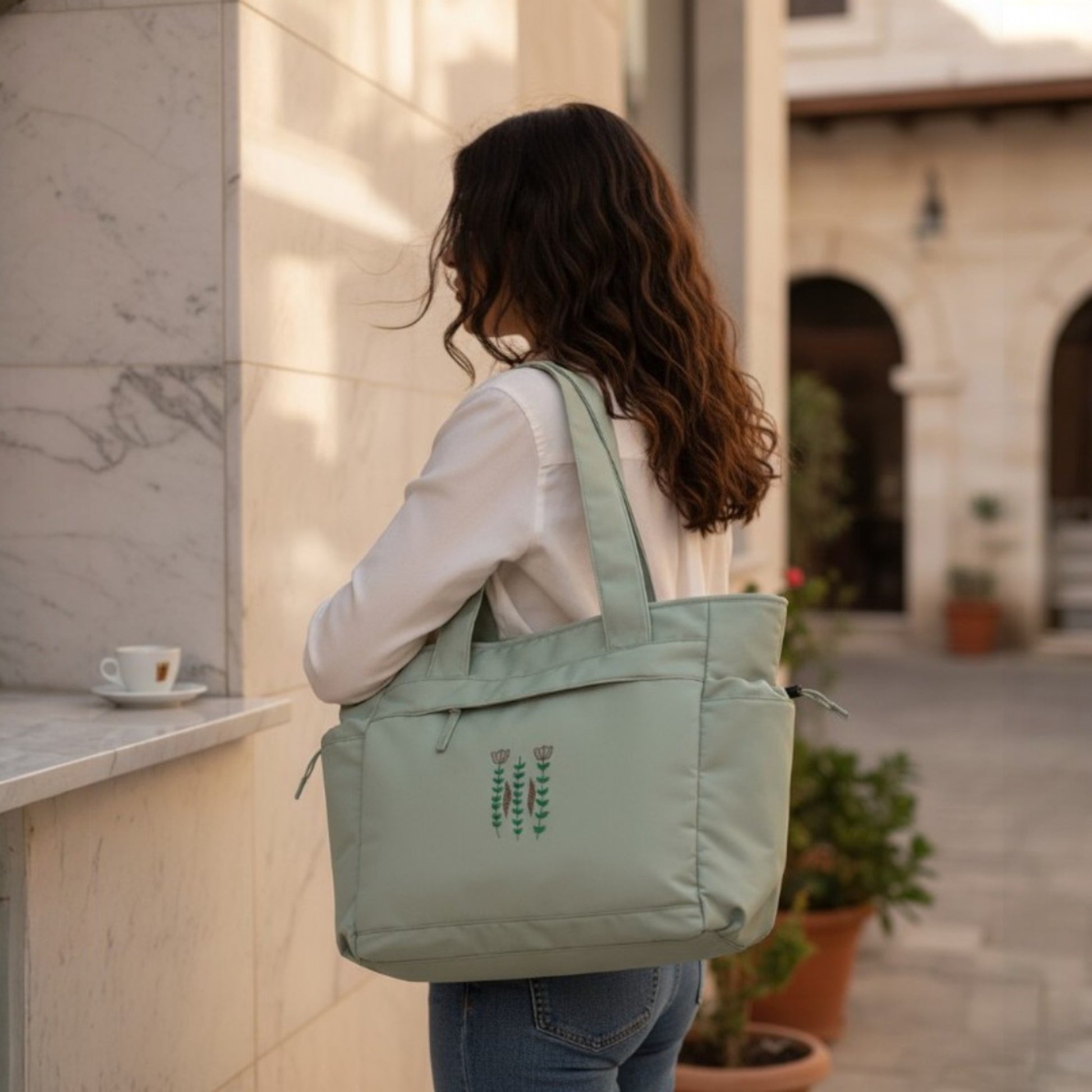 With its soft earthy embroidery, this oversized tote blends everyday practicality with timeless style. The minimalist floral design is inspired by the delicate patterns found on the traditional Lebanese coffee cup, known as the finjen shaffi - a cultural symbol of warmth, hospitality, and heritage. Crafted from 100% recycled polyester, it offers a spacious interior ideal for weekend escapes, while soft, wide shoulder straps provide all-day carrying comfort.