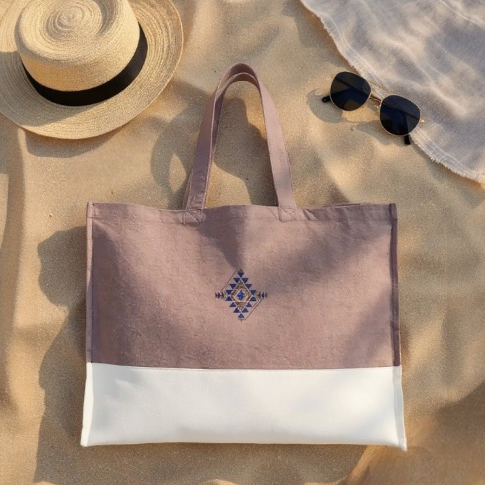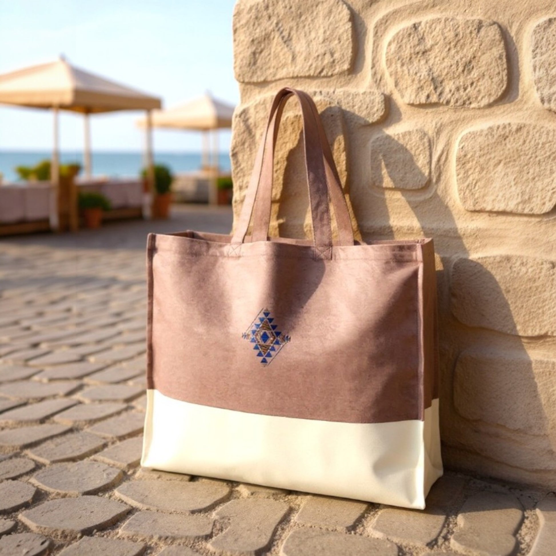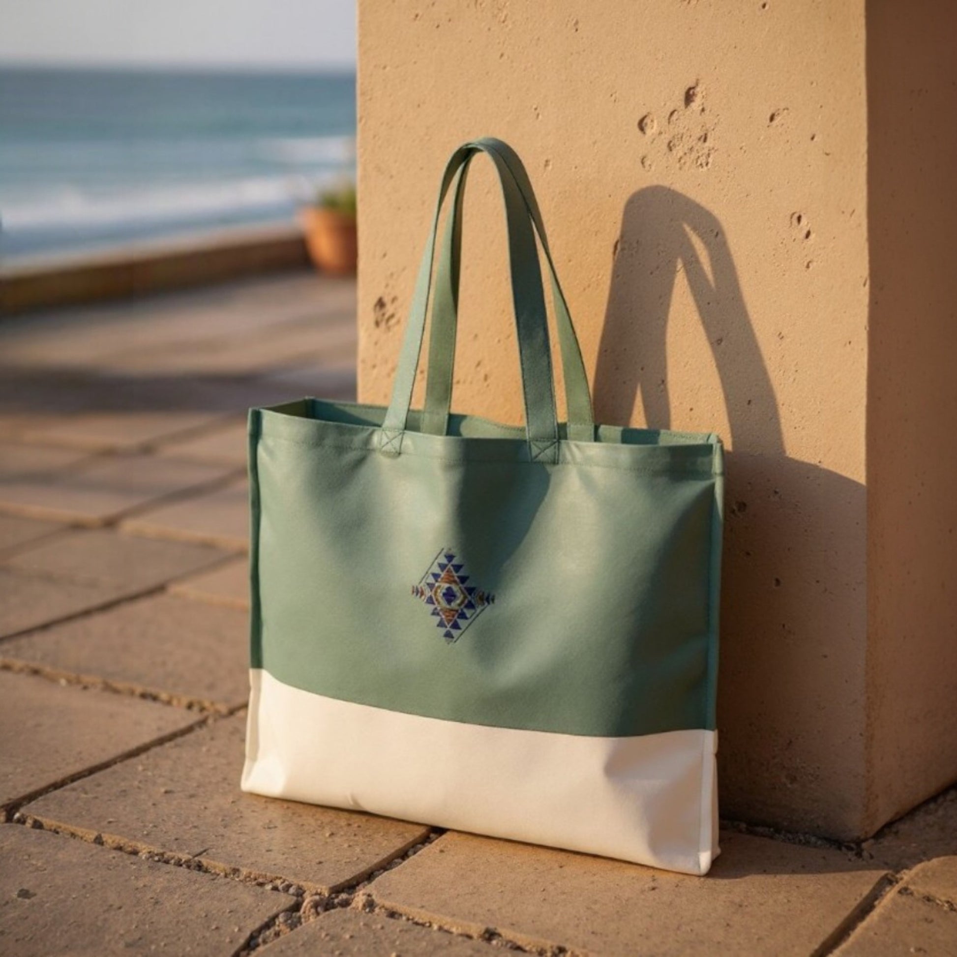 With its striking embroidered diamond motif, this contrast shopper blends everyday practicality with sustainable style. The design draws inspiration from Levantine tribal patterns, traditionally found in textiles and kilims, celebrating heritage through bold geometry and subtle symbolism. Crafted from 100% organic cotton canvas, this eco-friendly tote features a durable construction, contrast base, and wide straps for comfortable carrying. Its spacious interior makes it perfect for shopping, work, or daily essentials.