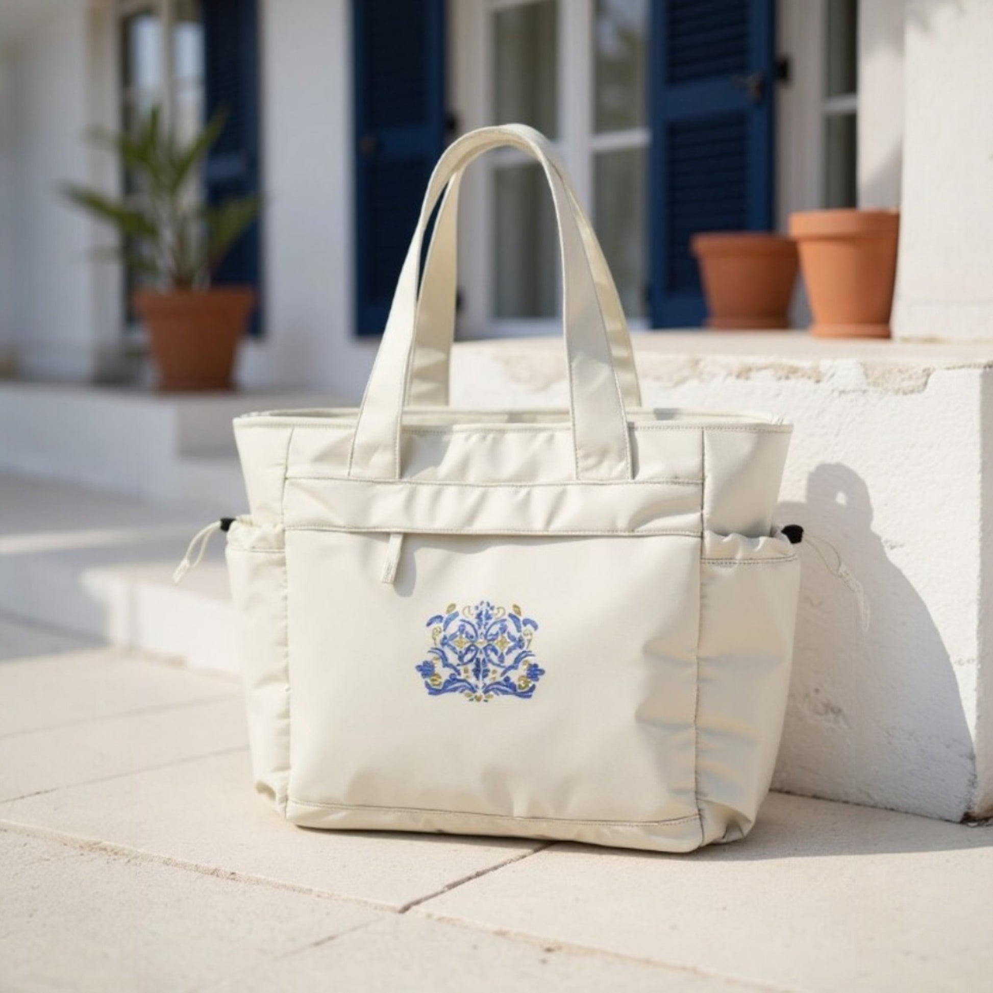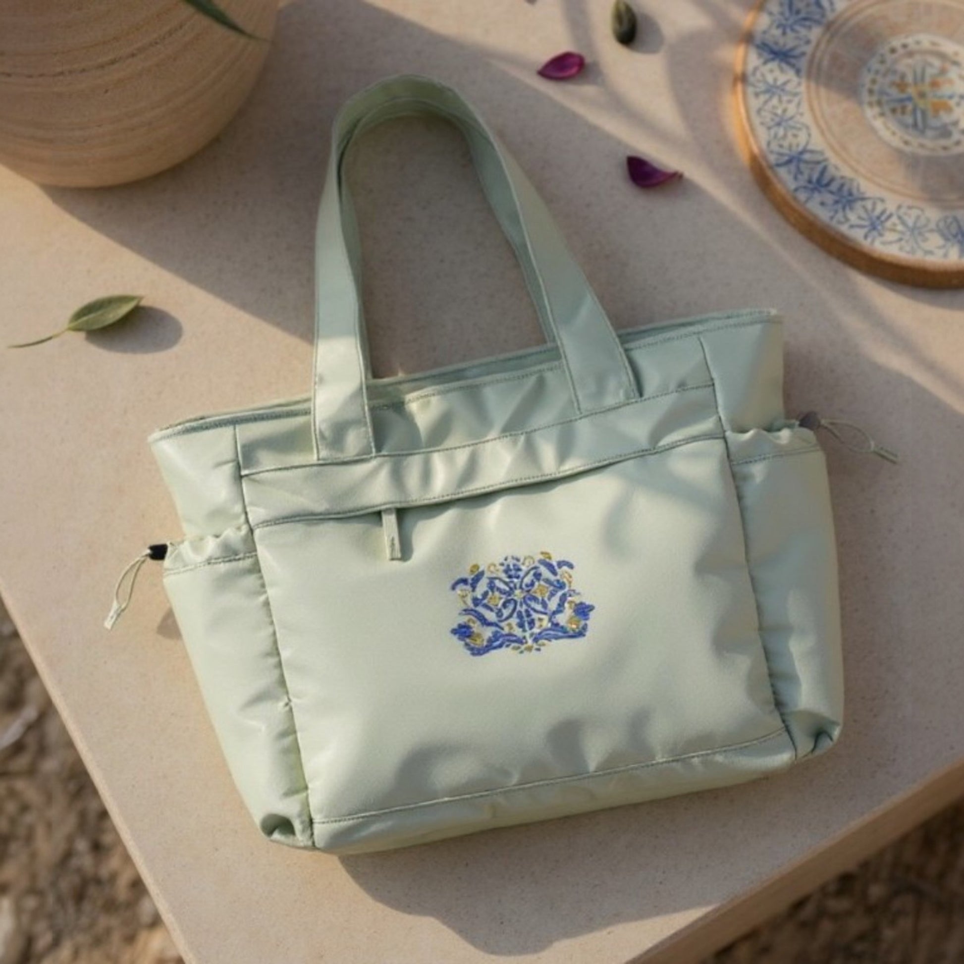 With its elegant blue and gold embroidery, this oversized tote blends everyday practicality with timeless style. Inspired by classic Arabesque motifs, the symmetrical flourish design reflects the flowing curves and ornamental beauty found in traditional Islamic art. Crafted from 100% recycled polyester, it offers a spacious interior ideal for weekend escapes, while soft, wide shoulder straps provide all-day carrying comfort.