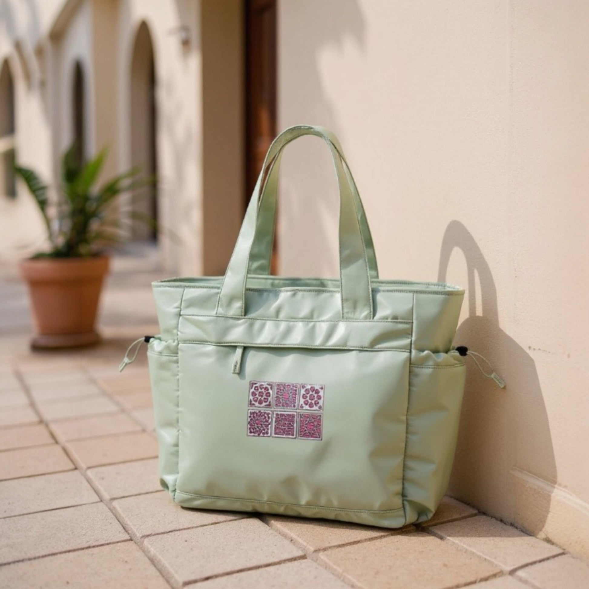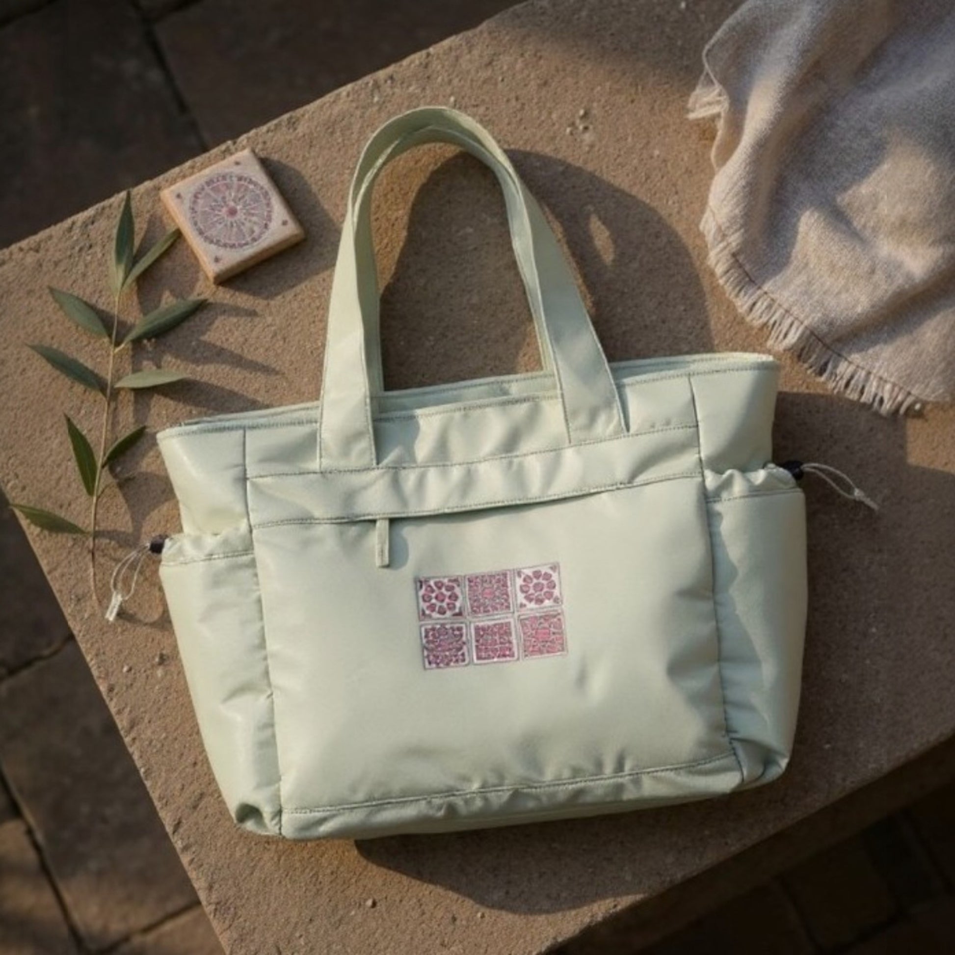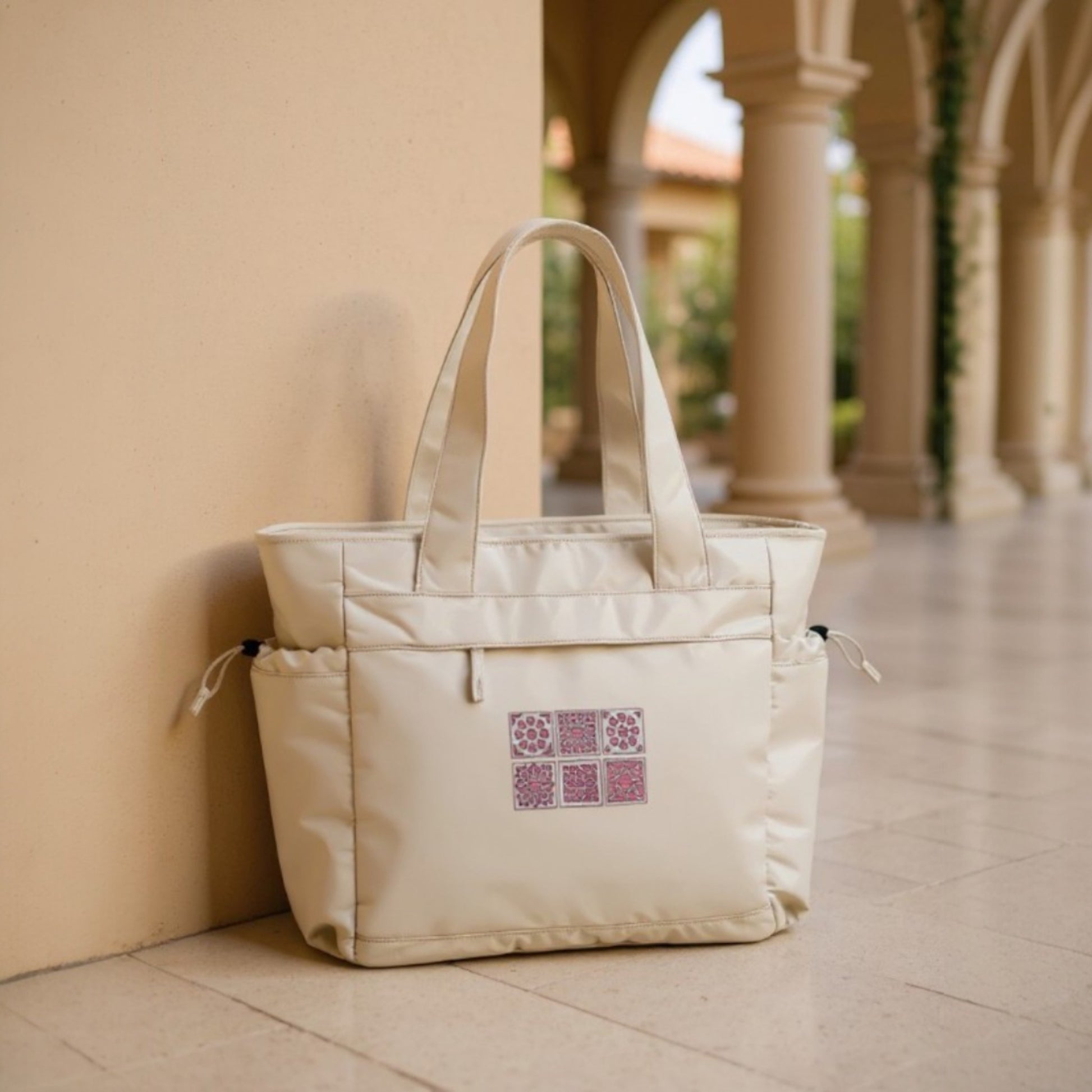 With its bold embroidery on the front, this oversized tote blends everyday practicality with timeless style. Inspired by North African and Middle Eastern mosaics, the six-tile motif showcases a rich variety of intricate geometric patterns that reflect symmetry, unity, and traditional craftsmanship. Crafted from 100% recycled polyester, it offers a spacious interior ideal for weekend escapes, while soft, wide shoulder straps provide all-day carrying comfort.