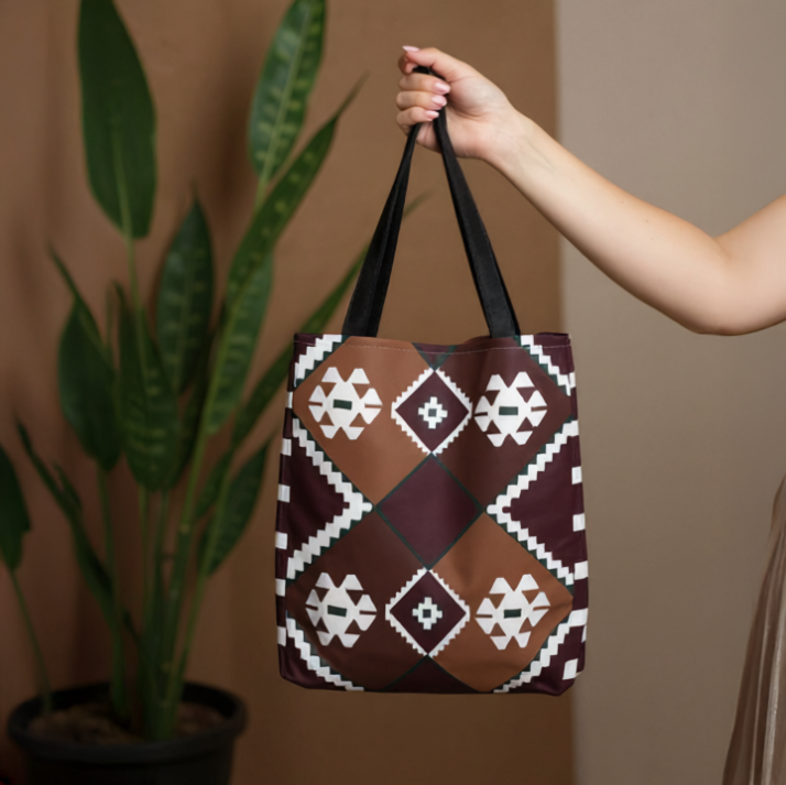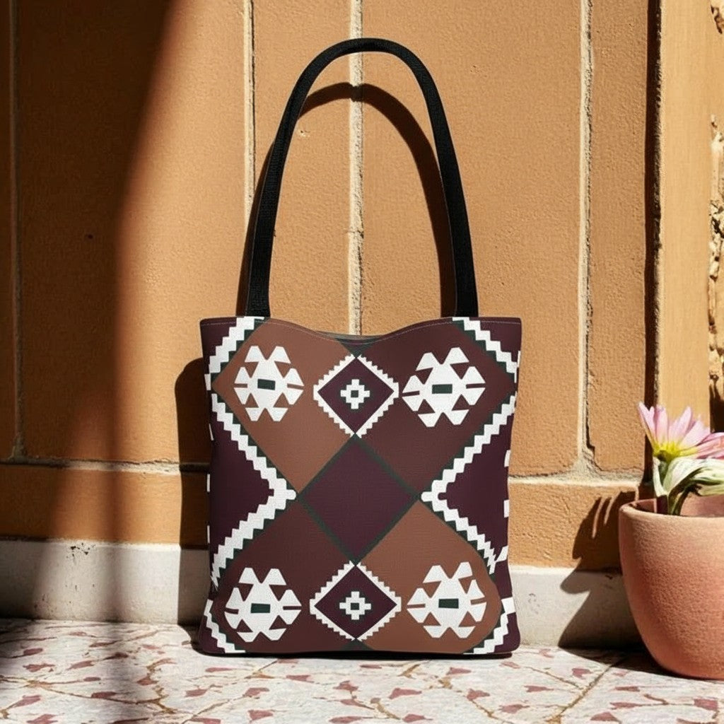 With its bold all-over print inspired by traditional kilim patterns, this printed tote celebrates the rich textile heritage of the Levant and surrounding regions. The geometric shapes and earthy tones reflect motifs often found in handwoven rugs - symbols of protection, identity, and storytelling passed down through generations.